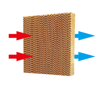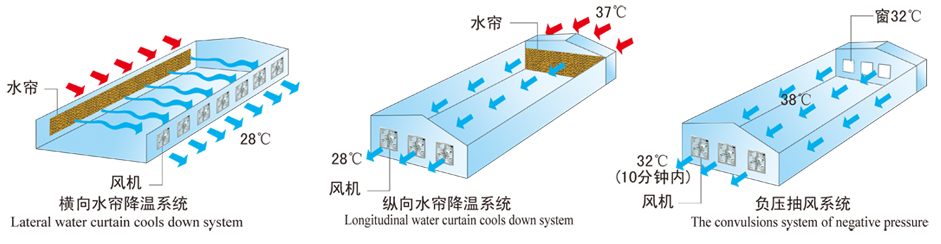 在現(xiàn)代畜牧業(yè)通風(fēng)技術(shù)中,濕簾和風(fēng)機(jī)搭配的縱向通風(fēng)降溫組合是經(jīng)濟(jì)有效的降溫通風(fēng)措施,濕簾的波紋纖維紙表面有一層水膜,室外干熱空氣通過負(fù)壓風(fēng)機(jī)的抽吸作用穿過濕簾,水膜吸收空氣中的熱量,經(jīng)處理過的涼爽空氣進(jìn)入室內(nèi),同時(shí)將室內(nèi)的污濁空氣排出去。